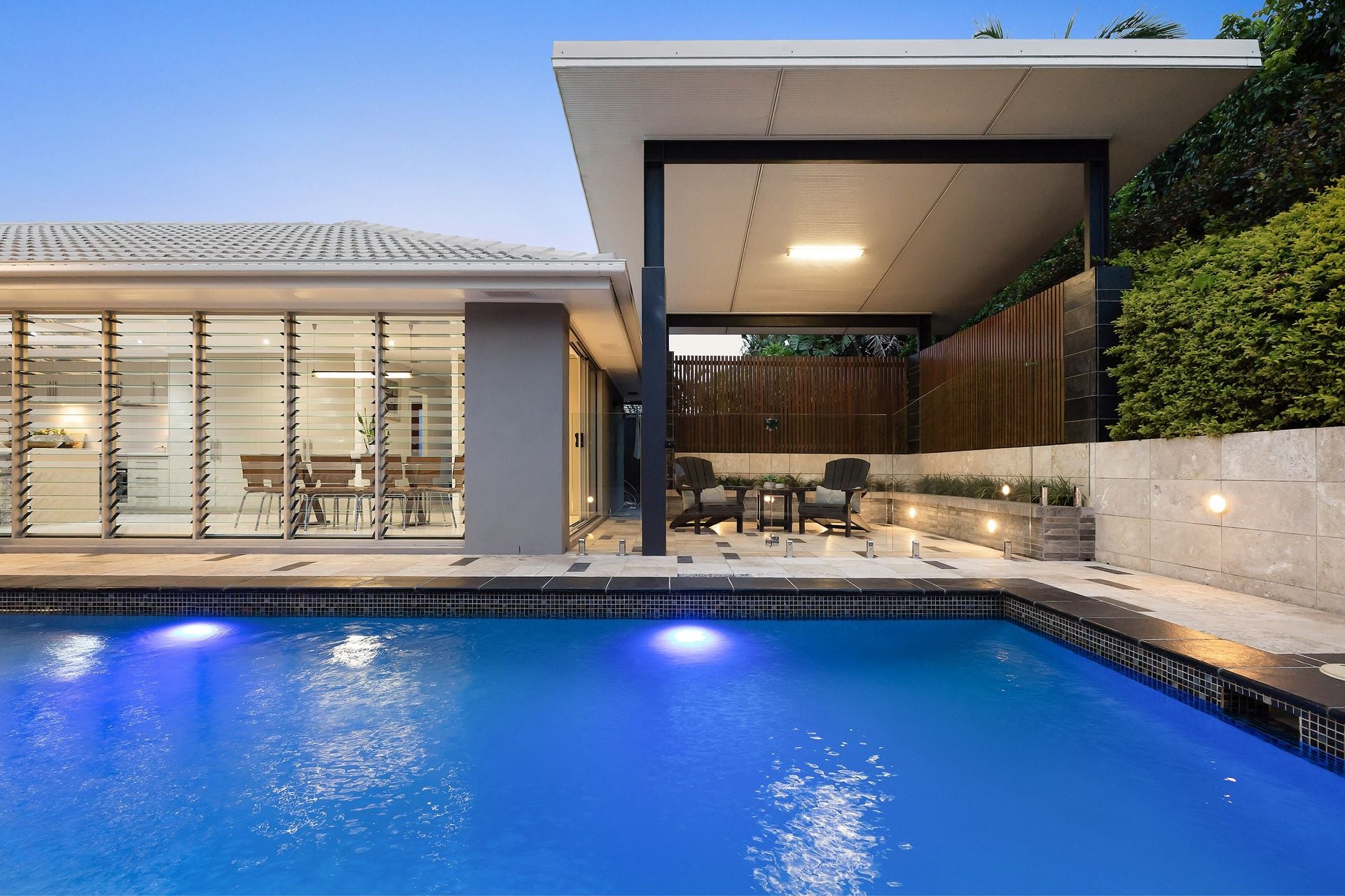 Just beyond, you're greeted by an inviting north-facing pool, fully fenced and screened by lush, established hedges, creating a private oasis for summer days and family fun.
