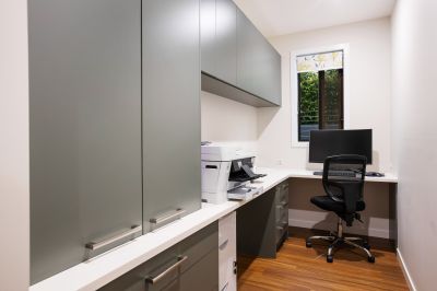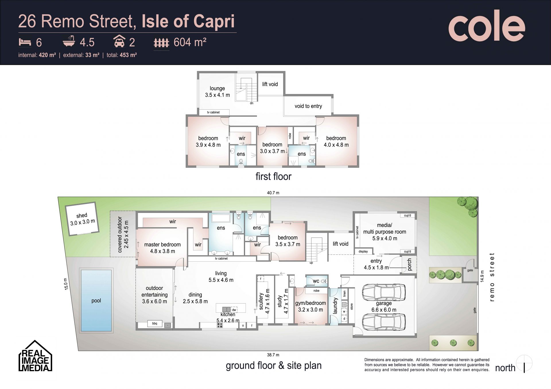 Completing the ground level is a dedicated media room / art studio or multi-purpose space, a versatile gym or 6th bedroom (with built in robes), and a separate home office with built in joinery.