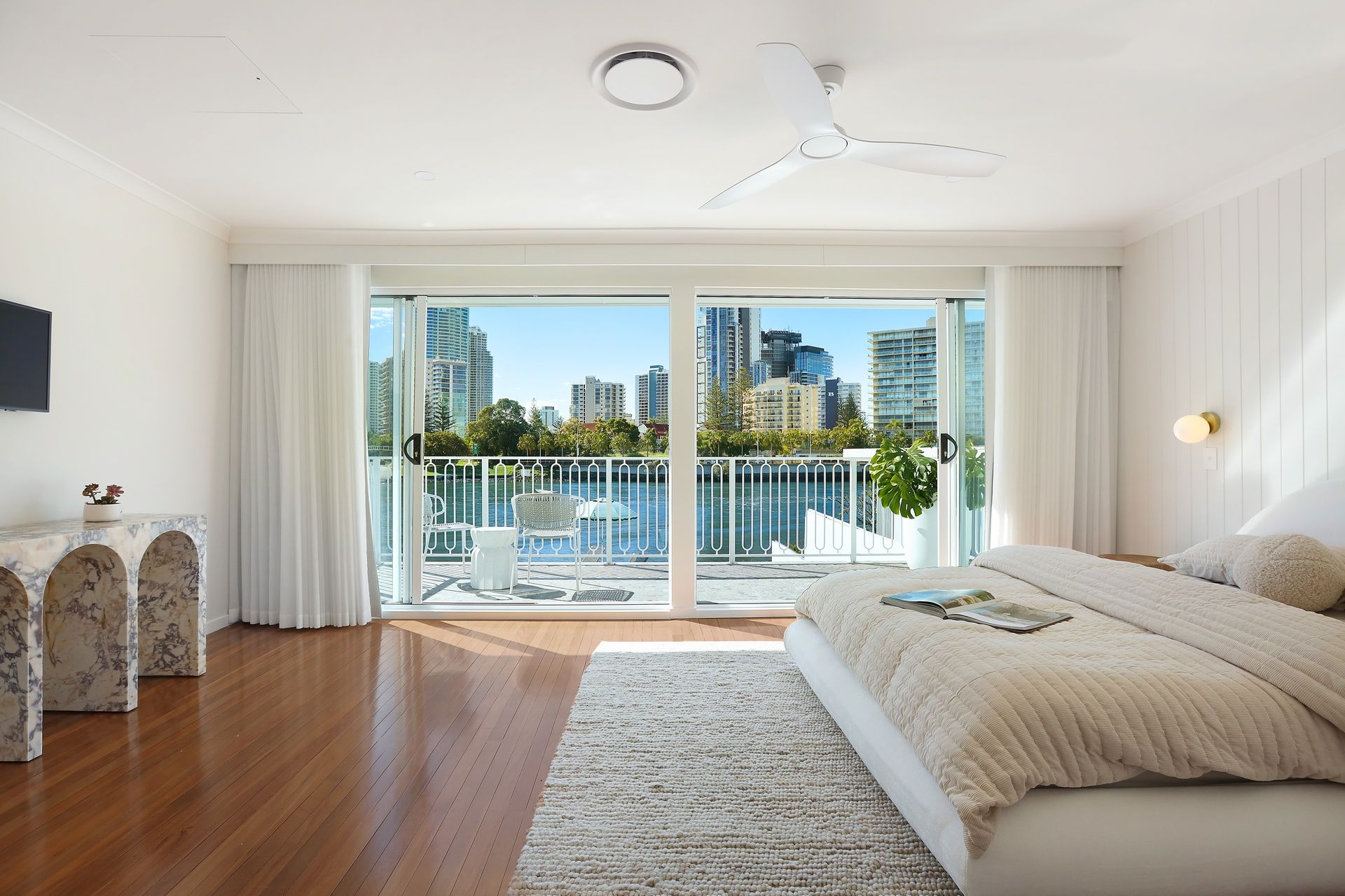 A striking Azure blue double door entry welcomes you into the home, setting the tone for its contemporary elegance. Inviting light filled interiors transition seamlessly to alfresco areas, where stunning river and skyline views create an idyllic backdrop. Whether enjoying drinks in the outdoor entertaining zone, lounging by the pool, or gathering on the riverfront, every space is crafted to elevate relaxation and socializing.