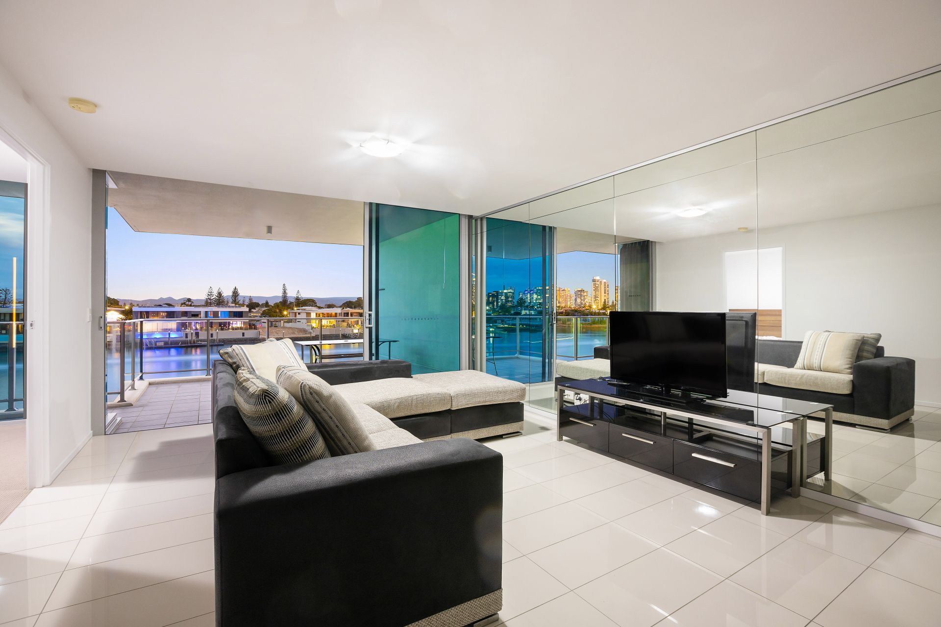 Showcasing a stunning riverfront position, this two-bedroom, two-bathroom open-plan apartment in the Sentosa Waters complex is a modern marvel.
